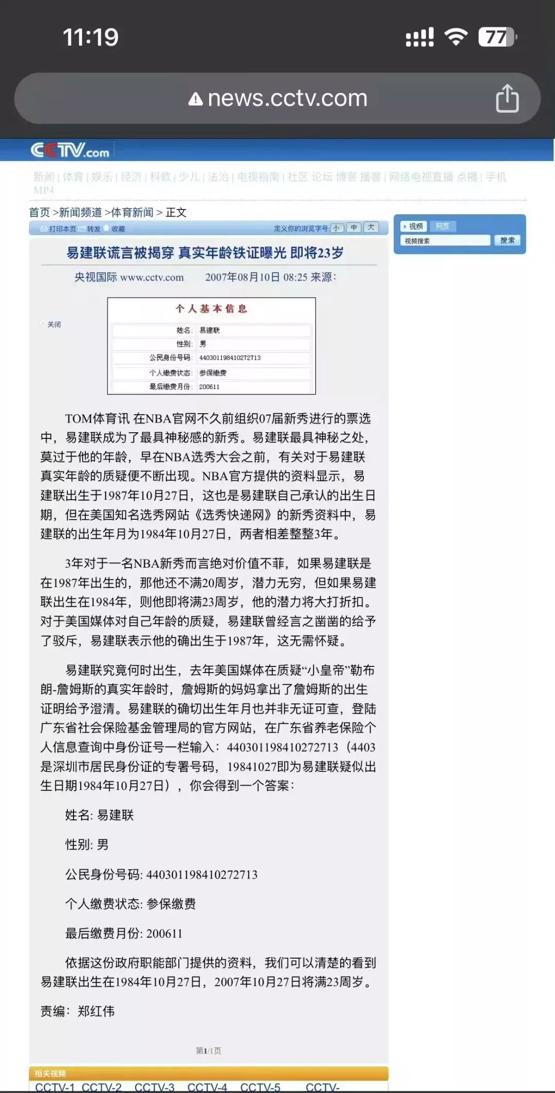 而易建联的身份信息也显然对不上,外界王人在臆想阿联到底身份证是84年已经87年,而在选秀之前央视网就曾报谈过阿联的个东谈主信息,临了空话也不攻自破。