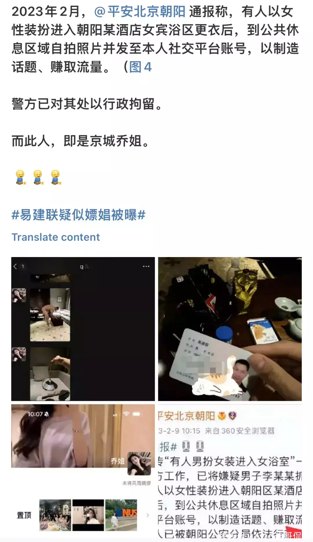 有网友深扒,爆料的东谈主是恶名昭著的京城乔姐,在2023年2月,这位男人就以女性装饰参加向阳某旅店女稀客室,到宇宙休息的区域拍照发到外交媒体赚取流量,制造话题炒作,之后警方对于这位 “京城乔姐” 进行行政拘留。况且许多曝出的像片来看,有网友大要在网上找到相通背,相通装饰的原图,独一即是身份证不一样,基本上确认是存在P图印迹的。